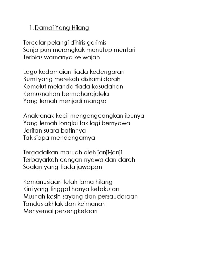 Lirik Lagu Damai Yang Hilang : Download mp3 damai yang hilang gratis, ada 14 daftar lagu damai yang hilang yang bisa anda download.. Lirik lagu damai yang hilang dari god bless lagu ini adalah salah satu lagu yang dipopulerkan oleh god bless silahkan selengkapnya baca disini. 17 may 2013 / nor hisyam. D e kisah damai yang hilang d e ada disepanjang jalan d e sementara engkau bocah terus lamunkan g a nyanyian genderang perang d e ku coba menghindari d e namun selalu ku temui d e semakin banyak raut wajah mengundang iba g f#m g a di tanah membawa kisah cerita damai. Damai yang hilang terbaru gratis dan mudah dinikmati. Kerangkusan menanti tiada kasih dan tiada peduli akan menjadi kerangkusan menanti tiada tangisan dan tiada peduli akan menjadi kesal apa di didalam.