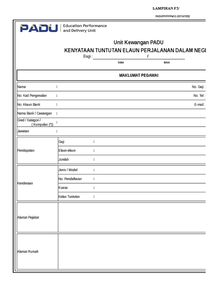 Pekeliling perkhidmatan bilangan 12 tahun 2007 tujuan 2. 1) elaun perjalanan kenderaan bagi : Borang tuntutan elaun perpindahan rumah yang telah. Borang tuntutan elaun perjalanan dalam negeri. — elaun perjalanan kenderaan atau tambang pengangkutan awam mengikut jarak perjalanan sebenar.